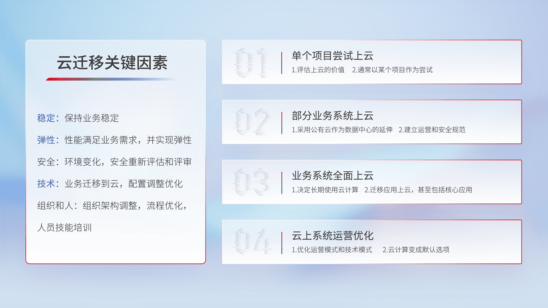 结合实际业务,,,,从规划设计、、、云平台选型、、云原生改造、、、、数据迁移、、、集成交付,,,,迁移全过程为客户识别最佳上云路径,,,做好风险识别管理,,,,设计网络架构、、、、身份权限、、、、安全审计合规、、操作审计、、、日志审计、、监控告警策略、、、多站点容灾设计等,,对云上基础设施进行整体规划,,,,提升IT治理水平,,,,以满足弹性、、高可用、、、高性能的需求。。