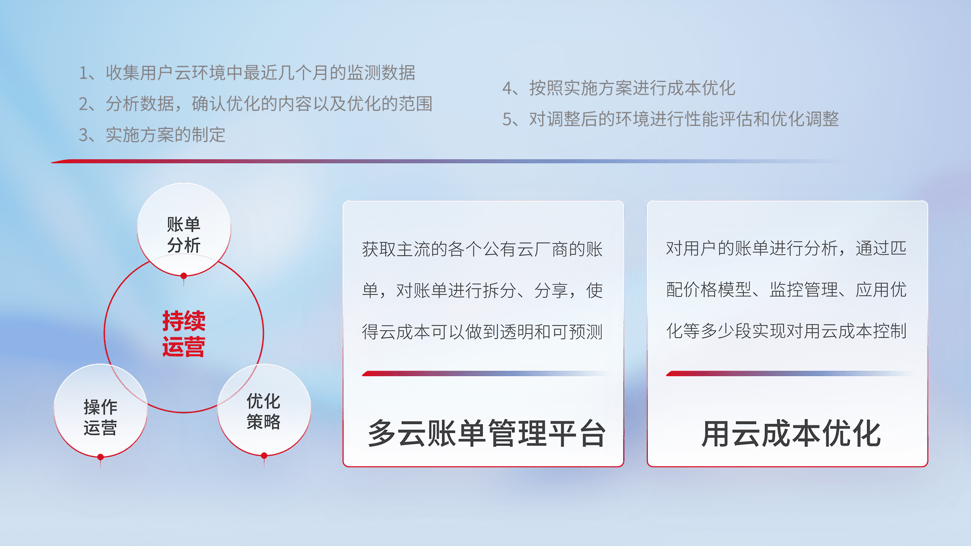 通过多云纳管,,,以统一的资源数据模型把客户的云资源进行抽象和封装,,,进而实现对多云资源的统一操作,,保障云资源管理的可靠性、、稳定性与可用性。。量身定制化运维内容,,,,配置、、、、开发运维、、、、补丁管理、、、、备份、、监控、、认证和访问管理、、、、审计和日常巡检等,,保障在用云过程中的可靠度,,,,稳定度以及高可用率。。。