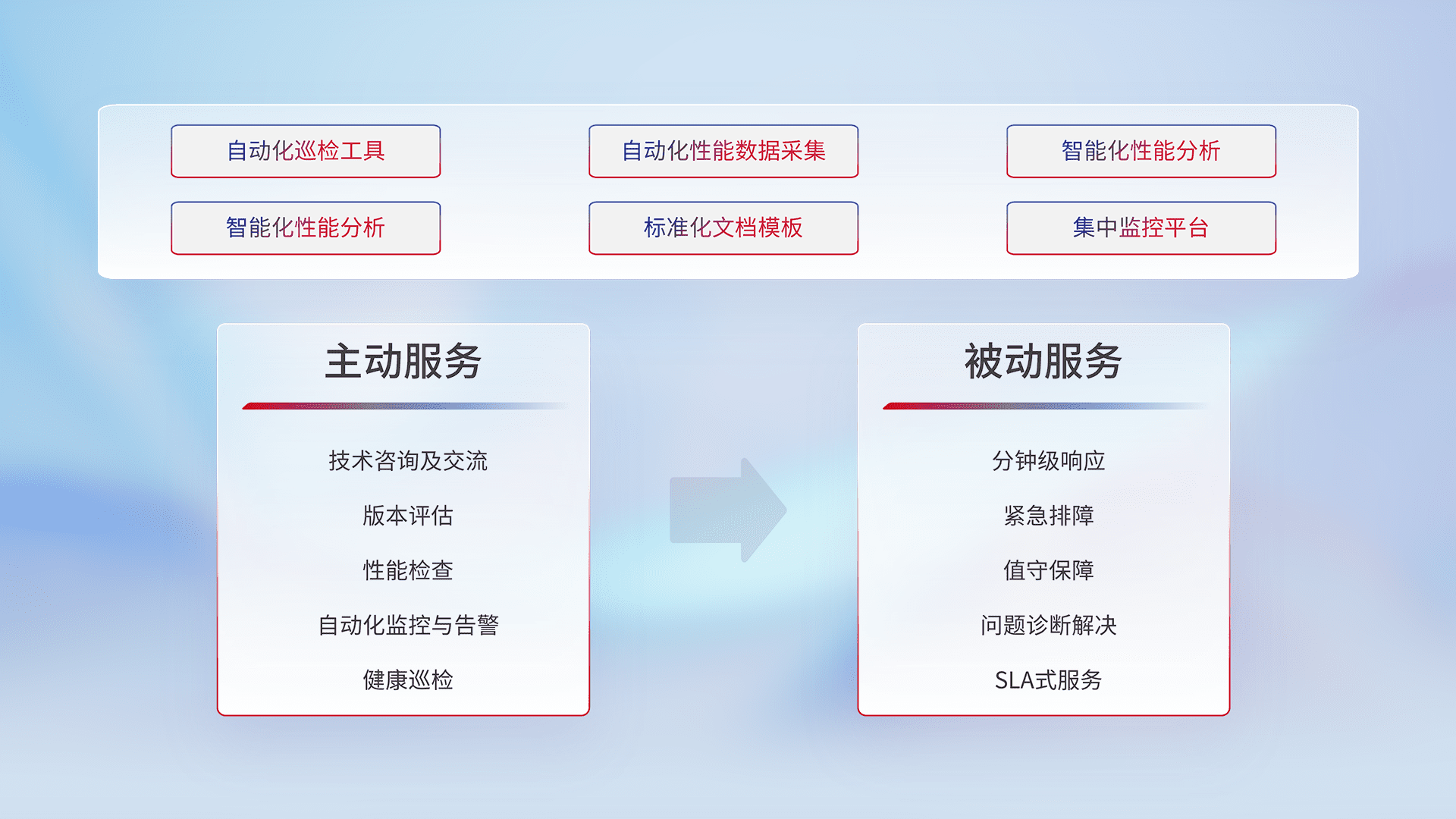 智能化工具和标准化文档,,保障服务质量,,提供主动服务(包含技术咨询、、、版本评估、、性能检查、、、自动化监控与告警、、健康巡检)和被动服务包含(分钟级响应、、紧急排障、、、值守保障、、问题诊断解决、、、SLA服务)。。。